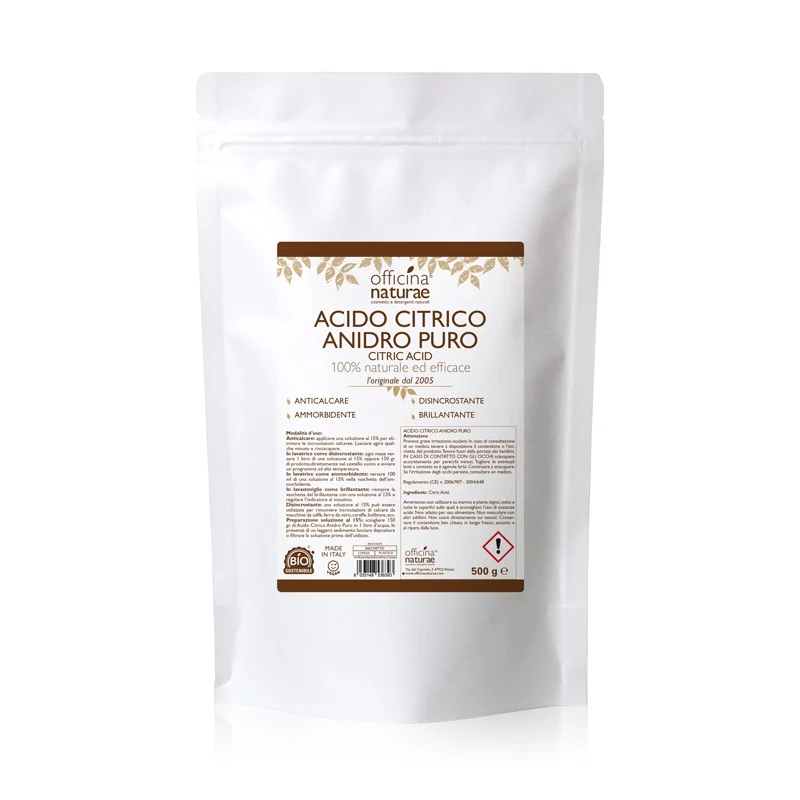 Acido citrico di sola produzione europea dal 2005. Di grado alimentare, quindi può andare a contatto con stoviglie e strumenti ad uso alimentare.