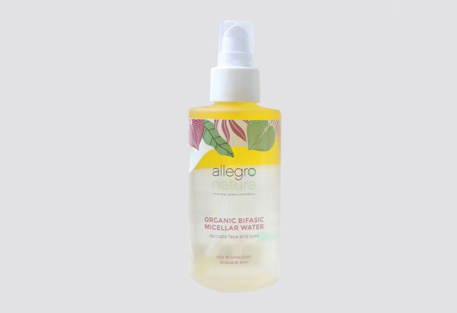 Acqua micellare bifasica per pelli secche e sensibili. Con aloe vera idratante e lenitiva, olio di vinaccioli bio dalle proprietà antiossidanti e acqua di kiwi bio ricca di vitamina C. Completano la formula la calendula bio e la camomilla bio emollienti ed addolcenti e la vitamina E. INGREDIENTS (Inci Name): Aqua – Coco Caprylate – Simmondsia chinensis seed oil- Aloe barbadensis leaf juice*- Vitis vinifera seed oil – Citrus aurantium amara flower water*- Actinidia Chinensis Fruit Water*- Glycerin – Lauryl Lactyl Lactate – Adansonia Digitata Seed Oil* – Helianthus anuus Seed oil* – Calendula Officinalis flower extract *- Matricaria Chamomilla Flower Extract* – Tocopheryl Acetate – Sodium Phytate – Sodium Benzoate – Potassium Sorbate Sodium Chloride – Parfum** – Citric acid Limonene- Citral- Linalool *Proveniente da agricoltura biologica / **AIAB approved Certificazioni: Bio Eco Cosmesi Aiab, Vegan Society, Garantito da Lav PACKAGING: Flacone 125 ML PAO 6M