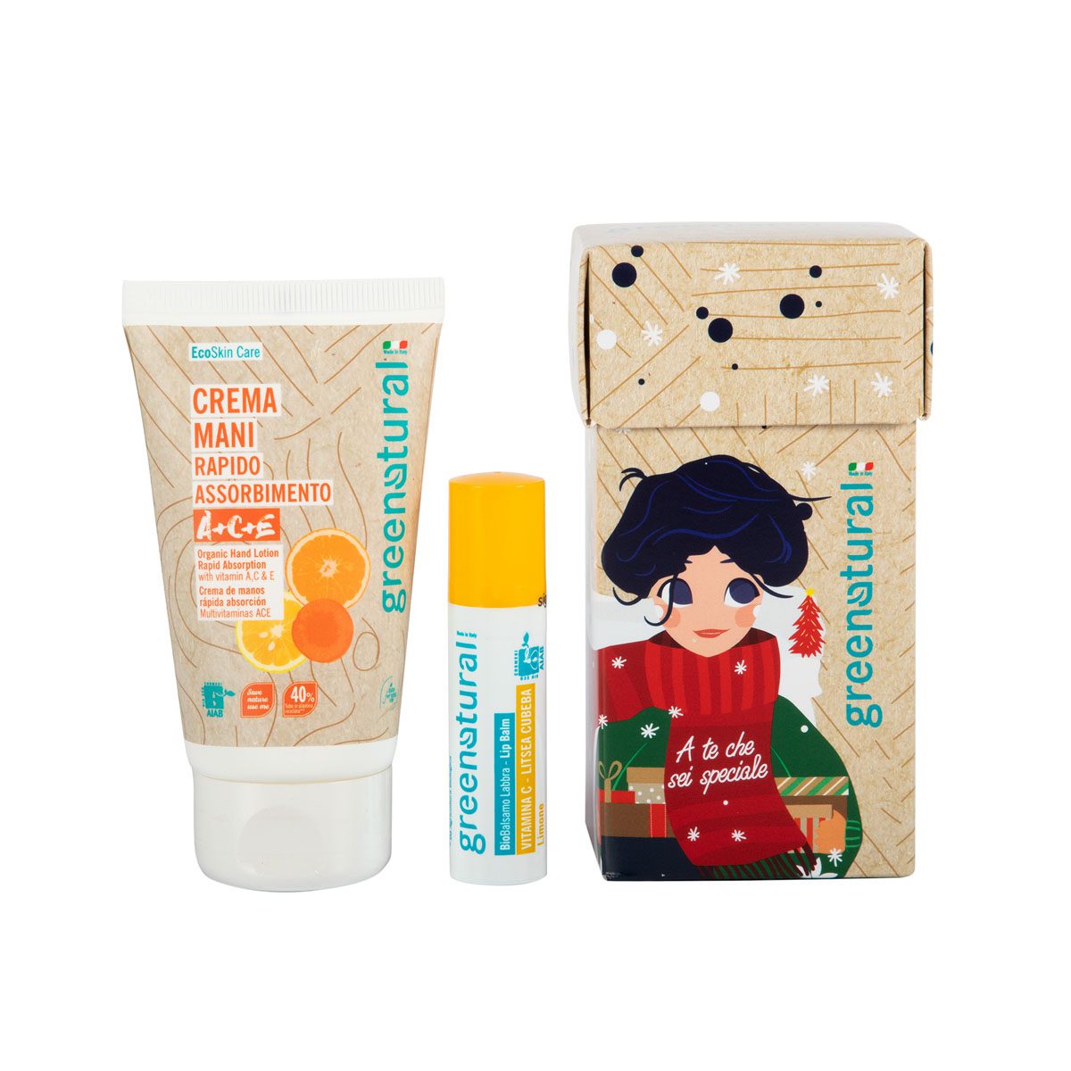 Prezioso cofanetto con una Crema Mani a rapido assorbimento ricca di vitamine A+C+E e un BioBalsamo labbra arricchito con vitamine C.