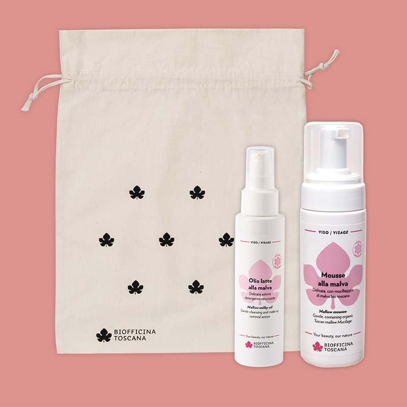 L’Olio Latte alla malva, ricco e vellutato, rimuove il trucco e le impurità senza aggredire, mentre la Mousse alla Malva completa il rituale di pulizia, lasciando la pelle fresca, morbida e luminosa.