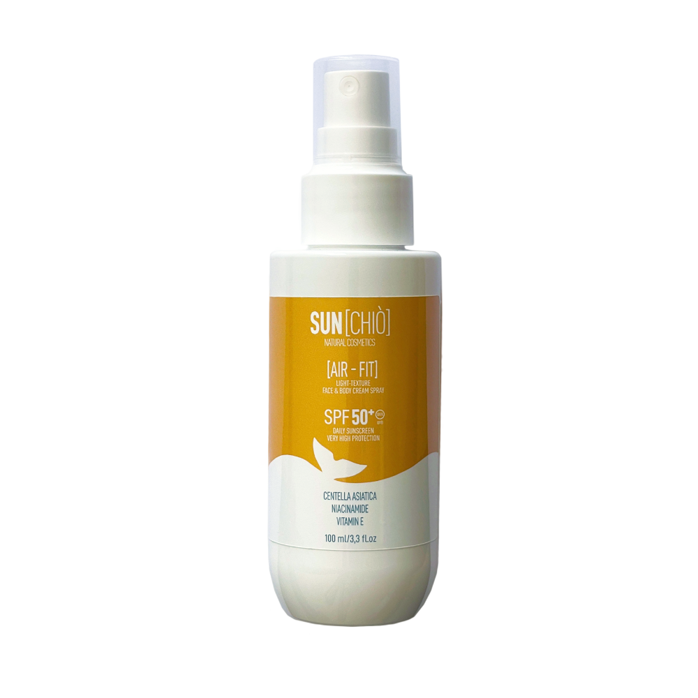 SUN[CHIÒ] AIR-FIT SPF50+ SPRAY 100 ML Spray è una crema per tutto il corpo a protezione molto alta, indicata per tutti i tipi di pelle, adatta anche per il viso e praticissima per il corpo: il suo spray ha un raggio di azione molto ampio. Questo permette un’applicazione molto pratica, facile e rapida. La sua texture ultraleggera AIR-FIT si fonde con la pelle senza lasciare tracce visibili né sensazioni di spessore: il comfort è immediato, il finish naturalmente luminoso.