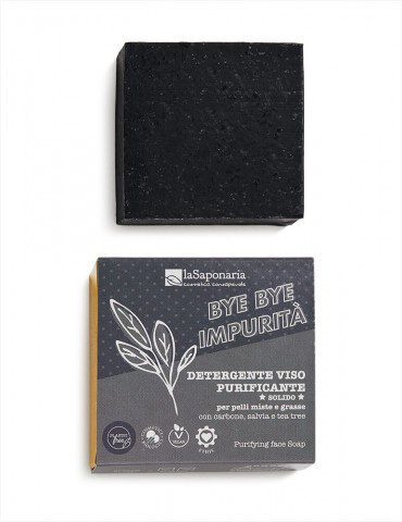 L’estratto di Zenzero, Vite rossa e Incenso, particolarmente efficace per trattare la pelle a tendenza acneica, riequilibra infatti il microbiota cutaneo gli oli di Neem, di rosmarino, di salvia, di Tea Tree svolgono un’azione sinergica antibatterica, seboregolatrice e cicatrizzante, il carbone vegetale invece è assorbente e detossinante mentre l’olio essenziale di menta dona una piacevole sensazione di freschezza. Packaging ZERO Waste: Scatolina in cartoncino riciclato Olio di Neem: purificante e rigenerante Olio essenziale di Tea Tree: purificante e riequilibrante Olio essenziale di Menta Piperita: fresco e stimolante Olio essenziale di Salvia: astringente e purificante Olio essenziale di Rosmarino: astringente e rinfrescante Estratto di Zenzero, Vite rossa e Incenso: purificante e riequilibrante Carbone vegetale: assorbente e detossinante Olio extravergine di oliva: emolliente e protettivo